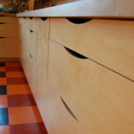 We use a wide variety of materials, including solid woods, such as, oak, cherry and meranti, plywood veneered in either maple or birch, aluminium sheeting and cast sandstone.